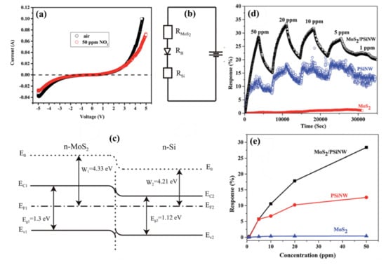 - Zhao, S.; Li, Z.; Wang, G.; Liao, J.; Lv, S.; Zhu, Z. Highly enhanced response of MoS2/porous silicon nanowire heterojunctions to NO2 at room temperature. RSC Adv. 2018, 8, 11070–11077. [Google Scholar] [CrossRef]