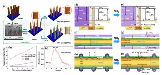 - Qin, Y.; Cui, Z.; Zhang, T.; Liu, D. Polypyrrole shell (nanoparticles)-functionalized silicon nanowires array with enhanced NH3-sensing response. Sens. Actuators B Chem. 2018, 258, 246–254. [Google Scholar] [CrossRef]