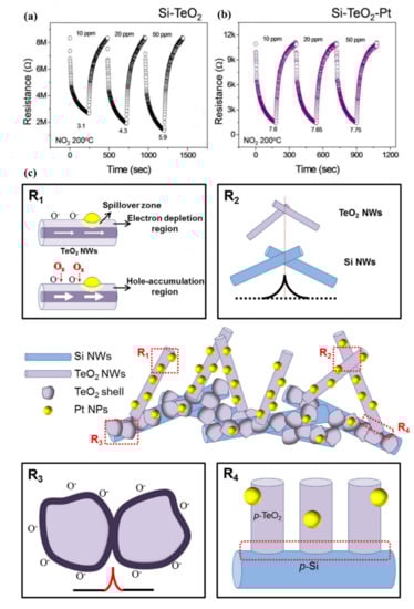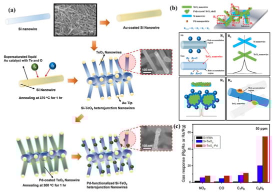 - Kwon, Y.J.; Choi, S.W.; Kang, S.Y.; Choi, M.S.; Bang, J.H.; Kim, S.S.; Kim, H.W. Enhancement of the benzene-sensing performance of Si nanowires through the incorporation of TeO2 heterointerfaces and Pd-sensitization. Sens. Actuators B Chem. 2017, 244, 1085–1097. [Google Scholar] [CrossRef]