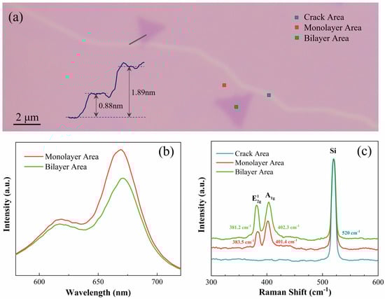 In the research methods for 2D material properties, Raman spectroscopy is the most commonly used technique in many fields, since it allows the essential characteristics of matter that are invisible by standard OM and AFM to be viewed []. Ultralow-frequency Raman spectroscopy has been used to reliably determine layer numbers of TMDC flakes, but this technique requires expensive adapters and nonstandard equipment setup []. Therefore, it is of vital importance to look for a suitable technique using the standard Raman system. Generally, high-frequency Raman peaks of lattice vibrations (i.e., phonons) in TMDCs exhibit several prominent features, including frequency, intensity and full width at half maximum, which contain useful information in characterizing the physical and chemical properties of the materials. Figure 2b,c show the Raman spectral mapping of the and the A1g peaks. From these two mappings, we can find the differences between the monolayer and bilayer areas. The frequency of the peak decreases, while that of the A1g peak increases with increasing layer number. The observed blueshift of the A1g peak originates from the constraint of atom vibration by the interlayer van der Waals force in MoS2, whereas the stacking-induced structure changes or long-range Coulomb interlayer interactions account for the redshift of the peak []. Therefore, as shown in Figure 2d, the Raman frequency difference between the and A1g peaks can be used as a fingerprint feature to identify the monolayer and bilayer MoS2 regions of the flakes []. However, the crack area cannot be identified straightforwardly by only using the frequency shifts of the or A1g peaks.