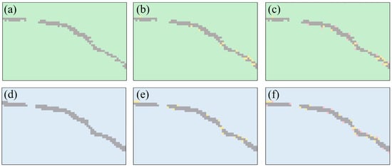 Raman spectral intensity mapping of the and the A1g peaks. Gray areas and the newly added yellow and red areas indicate the situation when the and the A1g peak intensity drops below (a,d) 68%, (b,e) 70% and (c,f) 72% of the monolayer signal, respectively.