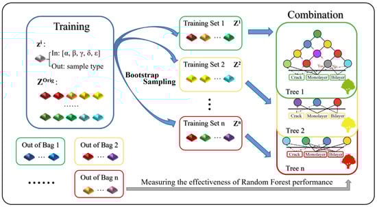 The introduction of machine learning enables computers to tackle problems involving knowledge of the real world and make decisions that appear correct. Here we implement the random forest algorithm (Figure 4) to search for a hidden correlation that may exist between the sample types and the characteristic data obtained from the spatial Raman mapping. This method has been successfully applied on a PL spectra study []. Compared to other classification procedures, the random forest machine learning approach has the advantage of high classification accuracy []. Furthermore, it can determine variable importance and model complex interactions among predictor variables []. Here, we define zi, including five types of spectral information (α, β, γ, δ and ε) as the input variables: α and β are the intensity and frequency of the peak, respectively; γ and δ are the intensity and frequency of the A1g peak, respectively; ε is the Raman frequency difference between the two peaks previously mentioned. The sample types of crack, monolayer and bilayer are defined as output variables, which are acquired from the k-means algorithm results. The ZOrig = [z1, z2, z3, …, zi, …, zk] are all training data for machine learning. Bootstrap sampling is used to expand a moderate number of data sets into a large volume of data sets required to improve the classification accuracy, which is a resampling technique used to estimate statistics on a population by sampling a dataset with replacement. Concretely speaking, we create n decision trees by generating new data sets Z1, Z2, ..., Zn, using n data sets randomly extracted from the original ZOrig with duplication permitted. For example, Z1 = [z3, z7, z16, zg, ..., zi] and Z2 = [z5, z5, z15, ..., zk], where g and i are integers (≤k), and some data are allowed to appear multiple times (e.g., z5 appears twice in Z2). As a result, bootstrap sampling can maintain the original distribution of the data and make the generated training sets independent of each other, thereby significantly improving accuracy [].