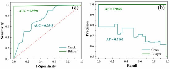 To further demonstrate the performance of our built random forest model, the receiver operating characteristic (ROC) and precision-recall (PR) curves are analyzed for crack/others and bilayer/others, respectively []. We use pre-labeled new data that does not appear as the testing set to calculate the accuracy, which is used to evaluate the performance of the trained model. The ROC curve is a popular method for accuracy assessment because it is comprehensive, understandable and visually attractive [,]. This method uses the area under the curve (AUC) for quantitative assessment, which plots 1-specificity on the x-axis against sensitivity on the y-axis. The range of the AUC varies from 0.5 to 1.0 and a perfect predictor gives an AUC score of 1, while a predictor that makes random guesses like coin tossing has an AUC score of 0.5. While the PR curve shows the trade-off between precision and recall for different thresholds. A system with high recall but low precision will return many results, but most of its predicted labels are incorrect in comparison to the training labels. However, a system with high precision but low recall is just the opposite, returning very few results, but most of the predicted labels are correct in comparison to the training labels. An ideal system with high precision and high recall will return many results, with all results labeled correctly.