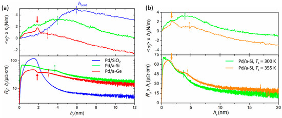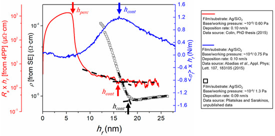 Figure 4. Evolution of resistivity ( ρ ~ R s × h f ) and stress-thickness product σ f × h f vs. nominal film thickness h f during growth of Ag on SiO2 by magnetron sputtering, as measured from in situ and real-time diagnostic tools: R s (from four-point-probe measurements; red solid line; data taken from [105], ρ (from spectroscopic ellipsometry (SE); hollow black squares; unpublished data by Pliatsikas and Sarakinos), and σ f × h f (from multiple-beam optical stress sensor (MOSS) measurements; data taken from [73]). Growth conditions (deposition rate and base/working pressure) are indicated in the corresponding legends, while all films have been grown at room temperature. The percolation ( h p e r c ) and continuous film formation ( h c o n t ) thicknesses are determined by the curves as explained in the text.