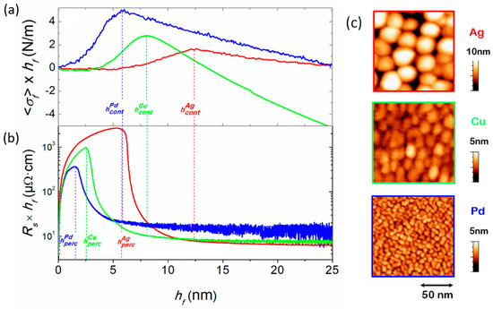 Figure 5. Real-time evolution of (a) σ f × h f and (b) R s × h f vs. h f for sputter-deposited Ag (red solid line), Cu (green solid line) and Pd (blue solid line) films on SiO2 at T = 300 K. Morphological transition thicknesses h p e r c and h c o n t are indicated on the respective curves with vertical dashed lines of the same color. (c) Atomic force microscopy (tapping mode) images (125 × 125 nm2) showing the surface morphology of Ag, Cu and Pd films with h f ~3 nm. More information on the growth conditions for each data set is provided in Table 1. Data taken from [71,78].