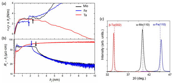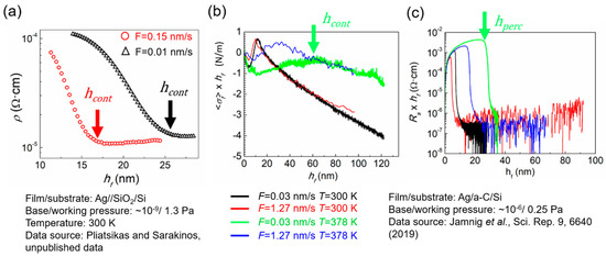 Figure 6. (a) ρ vs. h f curves, extracted from in situ spectroscopic ellipsometry, during room-temperature (300 K) magnetron-sputter deposition of Ag films on SiO2/Si substrates at two different deposition rates F of 0.15 (red circles) and 0.01 nm/s (black triangles). The position of h c o n t on the curves is indicated by solid arrows (unpublished data by Pliatsikas and Sarakinos) (b) σ f × h f vs. h f curves, extracted from in situ substrate curvature measurements, during deposition of Ag films on a-C/Si substrates at two values of F (0.03 and 1.27 nm/s) and T (300 and 378 K). (c) R s × h f vs. h f curves, extracted from in situ four-point probe measurements, during deposition of Ag films on a-C/Si substrates at two values of F (0.03 and 1.27 nm/s) and T (300 and 378 K). The positions of h c o n t and h p e r c on the curves at T = 378   K and F = 0.03 nm/s are indicated by solid arrows. Data in (b) and (c) are taken from [61].