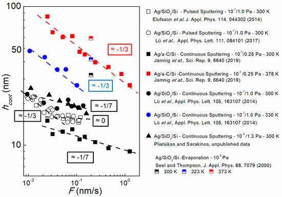 Figure 7. h c o n t vs. F (log–log scale) at various values of T in the range 300 to 378 K, during growth of Ag on a-C and SiO2 substrates by continuous and pulsed magnetron sputtering (data from [61,62,89,91]) and evaporation (data from [99]). The dashed lines are guides to the eye indicating the h c o n t vs. F slopes (provided next to each line) for selected set of data. More information on the growth conditions for each data set, including base and working pressure, is provided in the respective legends.
