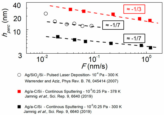 Besides h c o n t , we also plot in log–log scale in Figure 8 h p e r c vs. F ( h p e r c determined by four-point-probe measurements as shown in Figure 6) for Ag films grown on a-C using continuous magnetron sputtering, at T = 300 K (black filled squares) and T = 378 K (red filled squares) [61]. We see that the h p e r c vs. F line slopes are consistent with those in Figure 7 ( h c o n t vs. F ) for both low and high deposition temperatures, while the ratio h c o n t / h p e r c takes a value of ~2, irrespective of the growth temperature. This indicates that the morphology set at the early stages of island nucleation and coalescence remains consistent until continuous layer formation. Figure 8 also presents h p e r c vs. F data obtained during the growth of Ag on SiO2 by pulsed layer deposition (hollow circles) [111]. This set of data exhibits a negative slope of ~1/7 in the F range 10−2 to 10−1 nm/s with a tendency for larger slope for F < 10 2   nm / s , in qualitative agreement with the h c o n t vs. F lines for pulsed magnetron sputtering in Figure 7.