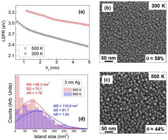 Analysis of SE data of electrically conductive layers, using the Drude model and the methodologies explained in Section 2.4, showed that h c o n t increases from ~26 to >80 nm, when T is increased from 300 to 500 K, i.e., higher temperature promotes 3D (in agreement with the data in Figure 7). Early growth stages of discontinuous layers are investigated by establishing the evolution of LSPR (ellipsometric data analyzed using Lorentz model as explained in Section 2.4) as a function of h f . The results are shown in Figure 9a, where it is seen that for both deposition temperatures the energy of LSPR decreases (from ~3.3 to ~2.4 eV, i.e., is red-shifted) with increasing h f . This trend signifies that the mean island size increases and island separation shrinks (i.e., larger fraction of the substrate is covered) as more material is deposited [55,79,119]. Concurrently, we observe that the LSPR vs. h f slope for T = 300 K is steeper than its 500 K counterpart, which means that increase of deposition temperature promotes out-of-plane island growth yielding a lower substrate coverage for a given nominal thickness [79,119]. These differences are confirmed by plan-view scanning electron microscopy (SEM) images of 3 nm thick films at the two growth temperatures (Figure 9b,c), respectively). At T = 300 K, the film surface features islands that are partially elongated and interconnected, indicating that incomplete coalescence has started, while the substrate coverage is θ = 58%. In contrast, at T = 500 K, islands are clearly more circular and larger (i.e., island reshaping is completed during coalescence), and θ = 44%. The qualitative picture and its consistency with the LSPR evolution is further supported by quantitative analysis of the SEM images with regards to the island size distribution and the mean island in-plane aspect ratio (AR). Data (presented in Figure 9d) show that the mean island size MS increases from ~82 to 110 nm2 upon temperature increase from 300 to 500 K, while AR decreases from ~1.8 to 1.5 for the same change in temperature (AR = 1 for circular islands).
