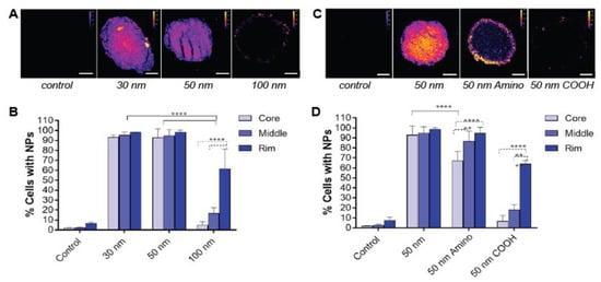 The effect of nanoparticle size (A,B) and charge (C,D) on penetration depth in spheroids. (A) Confocal images of 20 µm frozen sections of HCT116 spheroids after 24 h incubation with 30, 50 and 100 nm polystyrene nanoparticles. Scale bar: 100 µm. (B) The distribution of the different sized particles (30, 50 and 100 nm) across the spheroid, distinguishing the core, middle and rim. (C) Confocal images of 20 µm frozen sections of HCT116 spheroids after incubation with 50 nm polystyrene nanoparticles (unmodified, aminated and carboxylated polystyrene nanoparticles). Scale bar: 100 µm. (D) The distribution of the 50 nm particles with different surfaces (unmodified, aminated and carboxylated) across the spheroid, distinguishing the core, middle and rim (****, ** and * indicate p < 0.0001, p < 0.01 and p < 0.05, respectively). Adapted from Reference [], with permission of American Chemical Society © 2020.