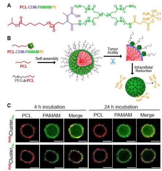The design and penetration depth of clustered particles, with (iCluster) or without (control, Cluster) a degradable bond (2-propionic-3-methylmaleic anhydride, CDM). (A) Chemical structure of platinum (Pt) prodrug-conjugated poly (amidoamine)-graft-polycaprolactone (PCL-CDM-PAMAM/Pt). (B) Self-assembly and structural change of iCluster/Pt in response to tumor acidity and intracellular reductive environment. (C) In vitro penetration of RhBiClusterFlu and RhBCluster Flu (cluster particles were dual-labeled with two dyes) in MCSs at pH 6.8 after a 4 h or 24 h incubation. The area marked with white circles was considered the inside area (Scale bar, 200 μm). RhB: Rhodamine B, Flu: Fluorescein. Adapted from Reference [], with permission from PNAS © 2020.