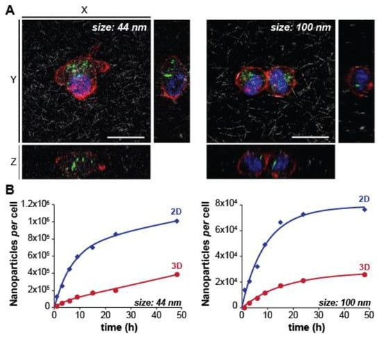 Recently, the differential nanoparticle uptake in scaffold-embedded cells was evaluated at a single cell level. Belli et al. compared the uptake of 44 and 100 nm polystyrene nanoparticles by cells cultured on plastic and within a collagen matrix []. Although the overall uptake of 44 nm nanoparticles was higher, there was a drastic decrease in internalization rate in 3D for both 44 and 100 nm particles (Figure 6). Apart from the known physical hindrance of the collagen network, the authors highlighted the possible involvement of the cytoskeleton structure on this outcome []. It is well-known that the cell’ shape in a 3D matrix is very different from the morphology of cells cultured on plastic/hard surfaces. On the latter, the contact surface between the membrane and the surface is very large, while in a scaffold, the cell membrane interacts with the ECM-mimicking scaffold at discrete locations []. This difference results in a stretched morphology with a well-defined cytoskeleton for cells grown on 2D substrates, whereas, in 3D scaffolds, the cytoskeleton typically re-organizes [,,]. Note that, despite its difference with 2D culture systems, the morphology of cells embedded in a 3D scaffold resembles more the in vivo physiology [,].