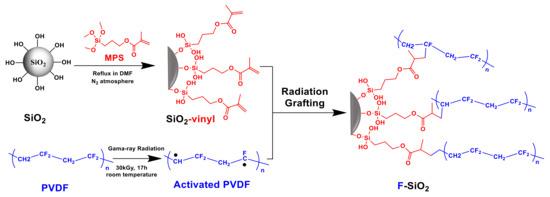 In the present work, we propose a new strategy to surface modify the silica (SiO2) nanoparticles with polyvinylidene fluoride (PVDF) based on the “radiation grafting” process. As shown in Figure 1, the vinyl functionalized SiO2 NPs were first prepared by the surface modification of the unmodified SiO2 using γ-methacryloxy propyl-trimethoxylsilane. The PVDF moiety was then covalently bonded to the NPs via radicals reacting with vinyl groups on the silica surface under Co-60 Gamma radiation. The structure of functionalized NPs was extensively characterized, and the effect of the reaction parameters under radiation on silica binding PVDF was investigated. It should be noted that, due to the radiation grafting method, all reactions above were conducted under extremely mild conditions. PVDF can be grafted onto the surface of NP directly rather than traditional chemical modification that involves additional complex procedures. Meanwhile, the PVDF-grafted SiO2 NPs (F-SiO2) can be well dispersed into the PVDF matrix, as compared with pristine silica, since the PVDF chain on the silica surface improved the compatibility between nanoparticles and the matrix.