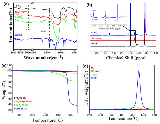 FT-IR (a), 1H-NMR (b), TGA (c), and DTG (d) curves of the SiO2, SiO2-vinyl, F-SiO2, and polyvinylidene fluoride (PVDF).