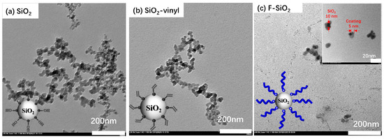 TEM image of the SiO2 (a), SiO2-vinyl (b), and F-SiO2 (c).