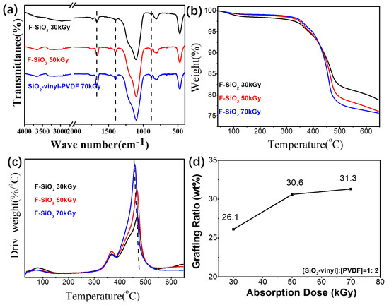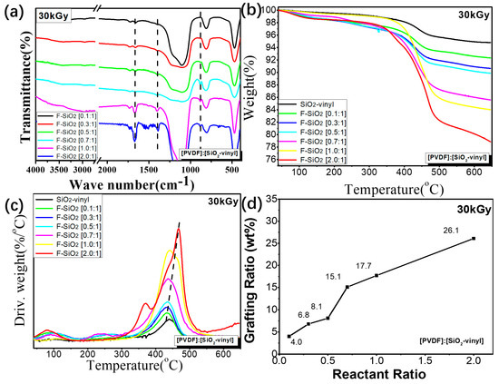 To get further information on the control of PVDF graft ratio on silica by this strategy, FTIR and TGA of the F-SiO2 NPs with different reactant ratio was performed, and the results were shown in Figure 5. It can be clearly seen that, with the increasing feed ratio of the PVDF, the intensity of the PVDF characteristic peak (1408 cm−1 and 880 cm−1, Figure 5a) and the thermal weight loss of the organic component (Figure 5b) in the F-SiO2 samples were significantly enhanced under the same absorption dose and reaction time (30 kGy, 17 h). The maximum weight loss temperature of the F-SiO2 was gradually improved in the same time frame (from 433 °C to 467 °C, Figure 4c), suggesting that the thermal stability increased with the rise of the grafting degree of PVDF. These results were mainly attributed to the increase of the PVDF feed ratio, which can significantly improve the reaction opportunities between the vinyl group on the surface of nanoparticles and the PVDF radicals generated during a gamma-ray radiation process, leading to the grafting degree of PVDF on the surface of nanoparticles being controlled.