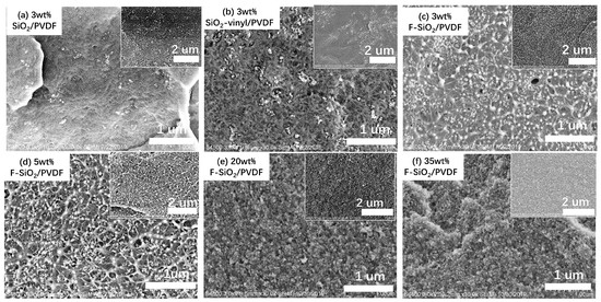 SEM images of the PVDF matrix incorporated with 3wt%, (a) pristine SiO2, (b) SiO2-vinyl, and (c) F-SiO2 nanoparticles, respectively. SEM images of PVDF matrix incorporated 5 wt% (d), 20 wt% (e), 35 wt%, and (f) F-SiO2 nanoparticles, respectively.