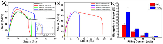 (a) Stress-strain curves of the PVDF matrix incorporated with 3 wt% SiO2, SiO2-vinyl, and F-SiO2 nanoparticles, respectively. (b) Stress-strain curves of the PVDF matrix incorporated with 3 wt%, 5 wt%, 20 wt%, and 35 wt% F-SiO2 nanoparticles, respectively. (c) The elongation at break of the F–SiO2/PVDF with the addition of a different content of pristine SiO2 and F–SiO2, respectively.