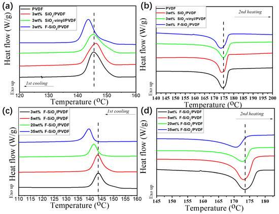 DSC spectra of 1st cooling (a) and 2nd heating (b) of the PVDF matrix incorporated with 3 wt% SiO2, SiO2-vinyl, and F-SiO2 nanoparticles, respectively. DSC spectra of first cooling (c) and second heating (d) of the PVDF matrix incorporated with 3 wt%, 5 wt%, 20 wt%, and 35 wt% F-SiO2 nanoparticles, respectively.