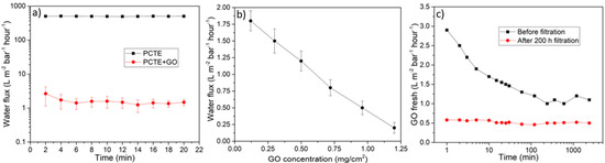 Figure 4. (a) Water flux comparison between the support layer alone (PCTE) and the support layer with the GO coating on top. Error bars are evaluated as the standard deviation of 10 different samples. Error bars on PCTE cannot be displayed in this scale. (b) The water flux through GO membranes with different thicknesses (reported as GO loading) at 1 bar of applied pressure is shown. (c) Water flux measured up to 2500 min on the same membrane, before filtration tests and after 200 h of operation.
