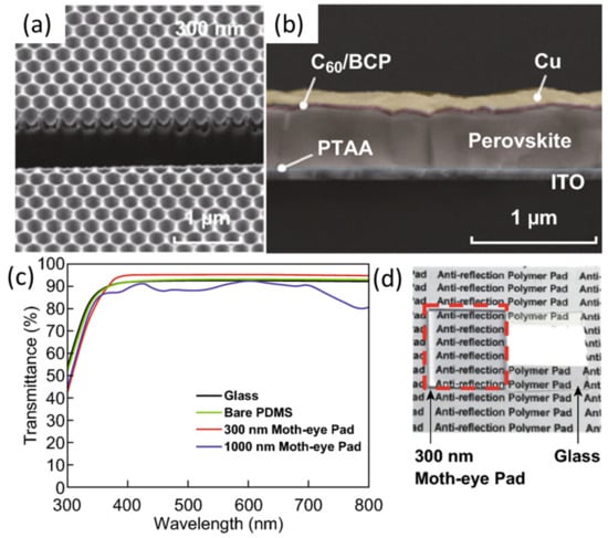 Nanostructured moth-eye antireflective surface. Effective antireflective (AR) technique for the solar spectrum. (a) Focused ion-beam-assisted cross-sectional scanning electron microscopic images of a moth-eye PDMS film with a 300 nm periodicity. (b) Perovskite solar cell (PSC) configuration imaged in a back-scattered electron mode. (c) Transmittance spectra of the differently prepared samples of glass, bare PDMS, and moth-eye films with 300 and 1000 nm periodicities. (d) Digital camera image demonstrating the antireflective effect of the 300 nm moth-eye PDMS film. Diameter and height of the hexagonal array are equal to periodicity in all PDMS films. These figures have been reproduced with permission from [12]. Copyright Springer, 2019.