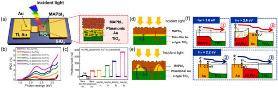 This mechanism is based on the injection of plasmon-induced hot electrons with sufficient energy to overcome the Schottky barriers at the metal/semiconductor into the conduction band of the neighboring semiconductor [26,27]. Au nanorods (NRs) were used to generate the majority of charge carriers in a plasmonic PV device, which are energetic enough to clear the Schottky barrier or quantum-mechanically tunnel through it, thereby producing the output photocurrent [28]. Under short-circuit conditions, hot electrons with visible wavelength incident photon-to-electron conversion efficiency (IPCE) values of ~1.0% and IQE of 2.75% were extracted, which are considerably higher than those previously reported for plasmonic photovoltaics under zero-bias conditions. Using Ag nanoplates integrated between Si nanowires (NWs) and PEDOT/PSS, Lui et al. proposed a concept to absorb and convert near-infrared (NIR) light into hot electrons. The hot electrons overcame the Schottky barrier between Si and Ag and flowed into the conduction band of the Si NWs. The external quantum efficiency of flexible NIR PV devices was improved by 59% using this strategy [29]. Park et al. recently developed a strategy to enhance the lifetime and flux of plasmon-nduced hot electrons, which are decisive for developing practical hot-carrier solar cells [30]. Nanodiodes consisting of a perovskite layer CH3NH3PbI3 (MAPbI3) were stacked on a plasmonic Au/TiO2. They found that quantum efficiency and the short-circuit photocurrent were increased by the deposition of MAPbI3 on both continuous thin-film Au and randomly connected Au nanostructures. They also confirmed that integrating MAPbI3 with the Au nanostructure notably prolongs hot-electron lifetimes, which can be associated with the high photocurrent in nanodiode (Figure 2).