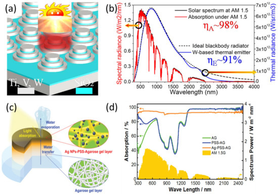 Preparation and application of thin-film solar thermophotovoltaics. (a) Schematic diagram of the Ti-based solar absorber. (b) Direct comparison between the standard spectrum of solar radiance under an air mass (AM) of 1.5 (solid line) and the solar energy absorption of the solar absorber under an AM of 1.5 (dotted line). Absorption efficiency of the solar absorber (dashed line). Reproduced with permission from [39]. Copyright Elsevier, 2019. (c) Schematic illustration of the double-layer solar vapor generation device. The top silver-poly (sodium-p-styrenesulfonate)-agarose gel (A-gPSS-AG) layer serves as the light-harvesting module, while the bottom AG layer acts as the water-transfer module. (d) UV–vis-NIR absorption spectra of AG, PSS-AG, and Ag-PSS-AG samples. Reproduced with permission from [41]. Copyright Wiley, 2019.