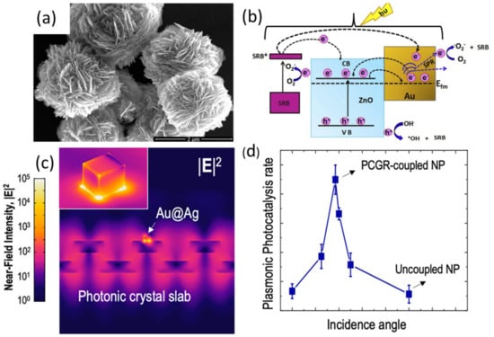 Hybrid plasmonic–photonic nanostructures. (a) FE-SEM images of ZnO/Au (1 mol %) nanoflower structure and (b) the transfer of the electron–hole pair in the ZnO/Au nanostructures shown in the schematic band diagram, responsible for the solar-irradiation-induced degradation of sulforhodamine B. Reproduced with permission from [50]. Copyright Elsevier, 2019. (c) Simulated near-field intensity of the Au@Ag–PC hybrid at θ = 3.5°, and (d) measured (1-reflectance-transmittance) spectra of the Au@Ag–PC hybrid at various incidence angles. Reproduced with permission from [53]. Copyright American Chemical Society, 2020.