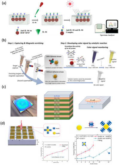 Biosensing devices based on photonic, plasmonic, and plasmon–photonic platforms. (a) Magneto-PC-embedded hydrogel detecting Interleukin-6 for real-time management of sepsis. Reproduced with permission from [61]. Copyright Royal Society of Chemistry, 2020. (b) Magnetic nanobead-based enzyme-linked immunoassay for the detection of influenza A virus. Reproduced with permission from [64]. Copyright American Chemical Society, 2018. (c) Hybrid plasmonic–photonic Bragg stacks with an 8 nm Ag capping layer for optical detection of the bacterial contaminants. Reproduced with permission from [65]. Copyright American Chemical Society, 2019. (d) Au NPs affect the peak shifting by conjugated avidin-Au NPs on the THz metamaterials. Reproduced with permission from [66]. Copyright American Chemical Society, 2016.