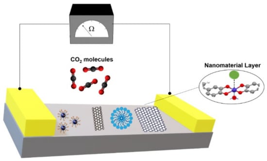 The conditions in which CO2 is monitored dictate the method and the materials that can be used in the sensor [3]. A variety of sensors have been developed based on different sensing principles including optical absorption [4,5,6], electrical resistance [7,8,9,10], field-effect transistors [11,12,13], and amperometry [14]. However, conventional CO2 sensors have several limitations such as higher cost, heavier weight, bigger size, and less durability [15]. To enable the widespread adoption of CO2 sensors in many aspects of modern society, inexpensive mass-producible devices are needed that offer simplicity, robustness, and ultralow power demand. Furthermore, there is a need for an accurate and reliable sensor that operates at harsh conditions of pressure and temperature such as in deep oil wells or nuclear reactors. To meet these needs, there has been a growing interest in recent years in nanomaterial-based CO2 sensors due to their cost efficiency, durability in harsh conditions, and stability [16,17]. The use of nanomaterials has been shown to improve traditional sensing techniques in terms of sensitivity, stability, response time, and selectivity [18]. The aforementioned benefits of nanomaterials are often ascribed to their high surface to volume ratio, high surface energy, quantum size effect, and high electron conductivity [19].