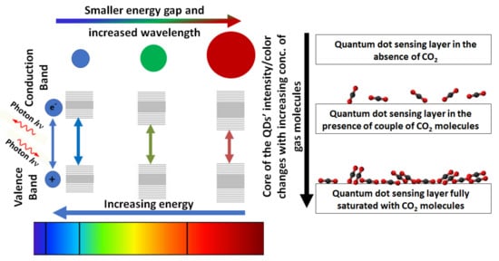 Quantum dots (QD) have been receiving much attention in gas sensing during the last decade. Specifically, in the area of colorimetric sensing, QDs are favorable in comparison to dye molecules owing to their quantum confinement as well as immunity to electromagnetic interference, narrow emission, wavelength size dependency, and superior photostability [81]. QDs are semiconductor nanocrystals (few nanometers in size) in which quantum confinement effects are proved. In other words, they are a group of nanocrystals in which electrons and electron-hole pairs are tightly confined. Quantum dots are either synthesized from semi-conductor compounds such as PbSe, CdSe, or PbS or they can be made simply of a single element such as germanium or silicon [82,83,84]. QDs are known for their unique optical and plasmonic properties due to their increased energy band gap as size decreases. Due to the energy quantization effects, quantum dots are capable of emitting colors more accurately. Upon reaction with CO2 and pH change in the presence of light, a photon hits an electron at the valence band. The excited electron moves from the valence band to the conduction band then relaxes again to a lower energy band by releasing a photon that matches the energy difference. This difference in energy corresponds to the color shift. The color shift would be affected by both the chemical reaction as well as the size of the quantum dot. Larger dots have smaller energy between bands with longer wavelengths and vice versa, as illustrated in Figure 5. The CO2 layer adsorbed on the surface of the QD will have an impact on the bandgap. However, the nature of this effect depends on the material of the QD and the type of interaction occurring with CO2. Since QDs have not been widely used in CO2 sensing it is hard to claim whether it would enhance the band gap or not. Many things could happen upon the adsorption of CO2 on the QDs’ surface. Firstly, the adsorption can cause a change in the intensity of the resonance. Secondly, Jin et al., 2006 [85] showed that the presence of a new layer of a different material on the surface of QD can cause a red shift due to a decrease in the bandgap. On the other hand, other researchers such as Joo et al., 2018 [86] proved that the adsorption of other chemical groups can cause surface defect passivation. This can result in a blue shift due to increasing bandgap. Furthermore, other researchers including Saha and Sarkar, 2014 [87] observed a bowing effect while increasing the concentration of the sorbed layer on the surface of QD. The effect of organic as well as inorganic passivation of QDs has been reviewed [88] with no sufficient referencing to the type of interaction of CO2 with QD.