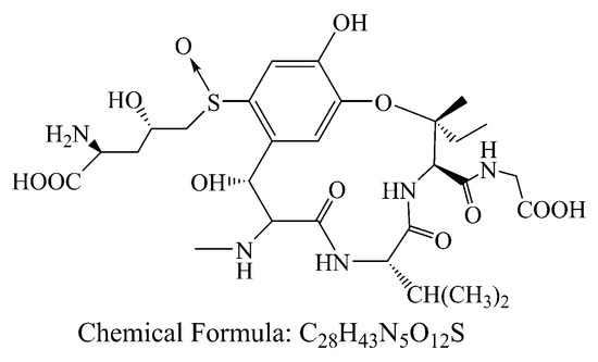 With the development of economy, society and technology, the environment pollutions become more and more serious. Besides antibiotics, heavy metal, dye and pigment from industrial activities, natural contaminants such as biotoxins and pathogenic microorganism with high toxicity should be also concerned in daily life. Ustiloxins are the secondary metabolites of fungus generated from rice false smut disease that is a worldwide fungal disease [1,2]. Ustiloxins can cause antimitotic behavior via preventing microtubule assembly and skeleton formation of eukaryotic cells, and seriously threaten animal/human reproduction and growth [3,4,5]. Among six identified ustiloxins, ustiloxin A (UA) and B are the main forms found with about 80 percent of the total ustiloxins in environment. In these days, most attentions were paid to study the occurrence, detection and biosynthesis of ustiloxins [6,7,8,9,10]. It was worth noting that the UA (C28H43N5O12S, 673.73, Figure 1) existed in the surface water from two paddy field, and the concentrations were 2.82 and 0.26 μg/L in Enshi, Hubei, China [8]. This indicated that this toxin could release into the environment, which might be as a potential threat to human and animals. However, there are few reports about how to reduce UA via chemical, physical and biological methods.