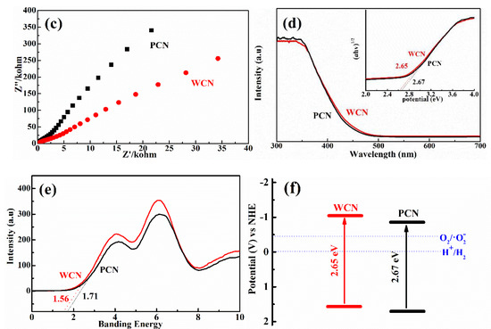 To further survey the enhancement photocatalytic activities of WCN, the photoelectrochemical abilities of WCN and PCN were compared by evaluating their transient photocurrent and electrochemical impedance spectra (EIS). As shown in Figure 5b, it could be seen that the transient photocurrent intensity of WCN was higher than that of PCN, and two catalysts presented well response during the light on-off recycles. This indicated that WCN could generate higher photocurrent under visible light irradiation. The EIS of WCN also showed the smaller diameter of the Nyquist plots compared with that of PCN (Figure 5c), demonstrating the better photogenerated charges transfer in the WCN. Therefore, the higher photocurrent and better photogenerated charges transfer of WCN were benefit to the photocatalytic activities, which may be ascribe to the uniform microstructure of WCN and the shorter charges transfer distance from interior to exterior on the surface of wormlike microstructures [24]. As shown in Figure 5d, it was found that the WCN and PCN had the visible absorption edges at about 460 nm, and the bandgaps were 2.65 and 2.68 eV, respectively, according to the formula (ahv = A (hv−Eg)n/2, where A, a, hv, Eg and n are the constant value, absorption value, light energy, bandgap value and 1 of n value for g-C3N4, respectively) [14,31]. The valence band of WCN and PCN were evaluated to 1.56 V and 1.71 V as shown in Figure 5e. The band structures of catalysts were presented in Figure 5f after band structure calculation. It was found that WCN showed the more negative conduction band of −1.09 V than PCN of −0.97 V, demonstrating that WCN had stronger thermodynamic driving force for photo-reduction that may promote the degradation of UA.