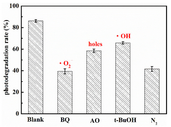 The photocatalytic reaction mainly depended on the kinds and quantity of the active radicals. When the energy of light was higher than bandgap of semiconductor, the electrons was excited and transferred from valence band to conduction band, while holes was left in the valence band. Then, the electrons on conduction band reacted with dissolved O2 in water to form superoxide radical anions (•O2−), which had strong reducing capacity. The holes might oxidize the OH− to hydroxyl radicals (•OH). Finally, the active groups such as electrons, holes, •O2− and •OH and so on reacted with the target organic molecules, and the target organic molecules were degraded steps by steps to final product such as CO2 and H2O. For investigating the role of active radicals in photodegradation of UA in the presence of WCN, the different scavenger reagents trapping measurement were carried out. The tert-butanol (t-BuOH), ammonium oxalate (AO) and 1,4-benzoquinone (BQ) were as •OH, holes and •O2− scavengers, respectively. As shown in Figure 6, the degradation rate decreased obviously when the BQ added in solution, indicating the •O2− was the main active group for UA degradation. The control test of N2 purging also confirmed the important role of •O2− during the photocatalytic reaction. However, when the AO and BQ added in suspension, there were slight reduction compared with without scavenger reagents (Blank). This may be ascribed to the valence band edges of g-C3N4 were lower than that of H2O/•OH, +2.40 V vs NHE (normal hydrogen electrode) that cannot directly oxidize the H2O or OH− to •OH. From previous reports [32,33], the small number of •OH may be indirectly from the following reactions of •O2− in water during photoreaction (O2 + e− → •O2−, •O2− + e− + 2H+ → H2O2, H2O2 + e− → •OH + OH−).