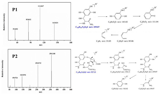 MS/MS spectra and proposed fragmentation of intermediates products or of UA (P1 and P2).