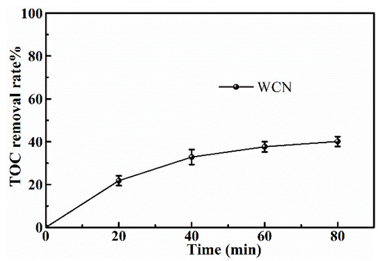TOC removal plots of UA over WCN under visible light irradiation.
