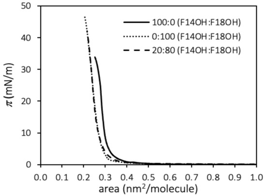 The surface pressure–Area per molecule (π–A) compression isotherms at 20 °C of monolayers of F18OH, F14OH and a 20:80 molar mixture of F14OH + F18OH are shown in Figure 1.