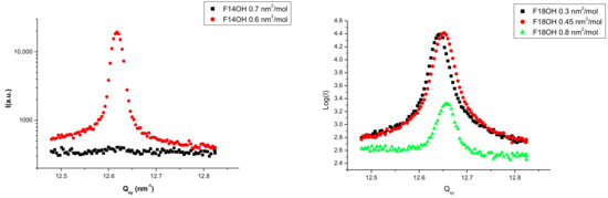 Diffraction spectra at 18 °C of the Langmuir films of F14OH (left) and F18OH (right) at different surface areas along the zero surface pressure plateau.