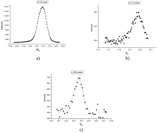 Qz integrated diffraction spectrum at 18 °C and 15 mN/m of the Langmuir film of F18OH. (a) (10) peak; (b) (11) peak; (c) (20) peak.
