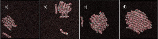 Representative top-view simulation snapshots of Langmuir films of F18OH at the surface of water, in the limit of very low surface density: (a) 8.28 nm2/molecule; (b) 6.37 nm2/molecule; (c) 2.59 nm2/molecule; (d) 1.29 nm2/molecule. The simulation boxes contain 10, 13, 32 and 64 alcohol molecules, respectively; water molecules are represented as dots for clarity.