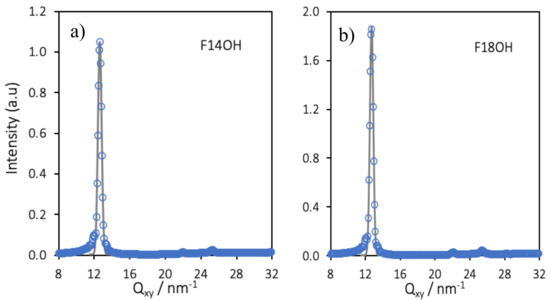 The monolayer of F18OH was further studied by GIXD at 15 mN/m. The hexagonal structure of the LC phase was confirmed by measuring the (10), (11) and (20) peaks (Figure 3). The positions and the FWHM of the diffraction peaks, obtained from the fitting of Gaussian peaks to the experimental data, are summarized in Table 3 in perfect agreement with the hexagonal lattice. The maximum intensity of the rod localized in the diffraction plan ensures that the chains are vertical.