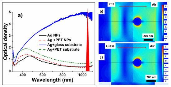 (a) Optical density spectra of Ag nanoislands on donor PET and glass substrates and of their corresponding deposits on acceptor glass slides; (b,c) Normalized field distributions around 200-nm sized Ag NPs, supported on PET and glass substrates, in the field of the 1064-nm plane wave. Right-hand color scales show the field enhancement magnitude.