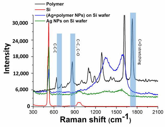 Chemical composition of the carbonaceous residue around the Ag nanoparticles transferred onto monocrystalline silicon substrates either from the glass, or the polymer substrates was analyzed by Raman micro-spectroscopy in the range of 300–2100 cm−1 (Figure 5), using as a reference the Raman spectrum of PET with its main bands at 1625 cm−1 (C=C stretching) and 1736 cm−1 (carbonyl (C=O) stretching) (see also Table 1) [48,49].