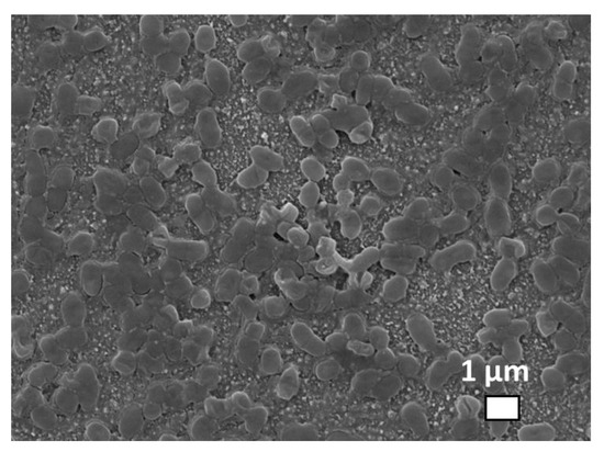 SEM visualization of Staphylococcus aureus bacteria incubated on the glass substrate with predeposited Ag nanoparticles.