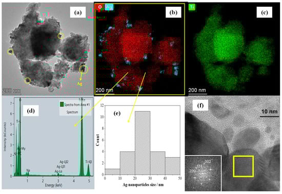 TEM analysis of the Ag/NT-U catalyst (with 10−4 mol g−1 Ag concentrtion); (a) TEM micrograph; (b,c) element maps obtained in STEM–EDS mode; (d) EDS spectrum of the entire aggregate; (e) size distribution of Ag nanoparticles; and (f) HRTEM image of Ag nanoparticles with an inserted fast Fourier transform (FFT) pattern on the lower left, obtained from the area marked by the yellow square and indexed according to the structure of native silver.