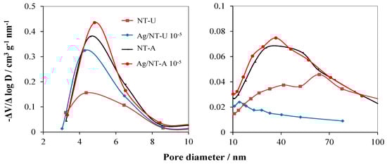 The BJH (Barret–Joyner–Halenda) model was used to estimate the pore-size distribution of the samples in the range of 1.7–100 nm diameter. As shown in Figure 6, the surface of the NT-A catalyst possessed higher volumes of pores in the diameter range of 3–8.5 nm compared to those of NT-U. Ag-loading on the NT-U significantly enhanced the volumes of the pores in this diameter range, while it just slightly increased for the NT-A catalyst. Besides, much lower volumes of pores in the diameter range of 10–100 nm appeared for NT-A and Ag/NT-A catalysts, but still higher than for NT-U and Ag/NT-U. The higher volumes of pores with smaller diameters resulted in larger specific surface area of the catalysts, as indicated in Table 1. Besides, Figure 6 also suggests that silveration of NT-U resulted in the increase of the volumes of pores with smaller diameters by the decrease of volumes of pores with longer ones, partly covering the surfaces of larger pores.