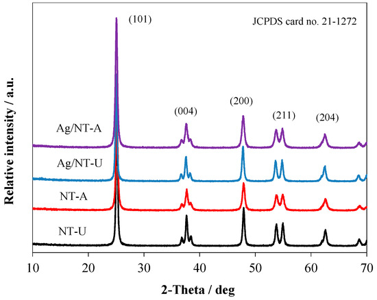 Furthermore, no distinct silver signal was observed in the XRD spectra of Ag/NT-U and Ag/NT-A under various Ag loadings, as shown in Figure S3. It is highly likely that the low amount of Ag-loading remained below the detection limit of the equipment. As a result, all diffraction peaks of the silver-modified catalysts (Ag/NT-U and Ag/NT-A) are rather similar to the unmodified ones (NT-U and NT-A). In addition, silver-modification did not significantly affect the crystallinity of the catalysts either (Figure S3 and Table S1) [,]. Zhou et al. obtained a pure anatase phase for rod-like N-doped TiO2/Ag composites prepared by sol–gel method. The average crystallite size of the samples was 16.4 nm []. In addition, Gao et al. also reported a pure anatase phase of Ag/N-TiO2 prepared by hydrothermal method, with the average crystallite size of about 36.1 nm [].