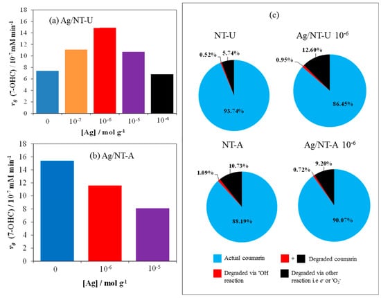 Besides specific surfaces areas, photocatalytic activities of Ag/N-TU and Ag/NT-A with various concentrations of Ag (as nanoparticles) were also investigated in coumarin solutions (Figure S5). The photocatalytic performances were evaluated on the basis of the initial rates of 7-OHC formation. Silver-modification on the surface of NT-U catalyst remarkably enhanced the formation of 7-OHC to the initial rate of 14.9 × 10−7 mM min−1 at the optimum Ag concentration of 10−6 mol g−1, as shown in Figure 10a. It is well known that silver-modification of such catalysts plays a crucial role in the photocatalytic activity, specifically trapping photo-generated electrons, and thereby promoting effective charge separations [,,]. However, Ag-loading above 10−6 mol g−1 reduces the photocatalytic activity because too much silver on the catalyst surface could be detrimental to photonic efficiency. This phenomenon may be interpreted by consideration of several factors. As discussed above, silver nanoparticles can enhance the specific surface area of NT-U, which contributes to a better photocatalytic efficiency, along with increased charge separation. However, the coverage of the active excitable sites on the catalyst surface reduces the number of photons utilized for excitation of the semiconductor. Hence, these opposite effects led to a maximum efficiency at 10−6 mol g−1 silver concentration. The decrease of the active sites will be the dominant effect at higher Ag concentrations. Earlier literature also mentioned similar tendencies [,,,,], but those studies dealt only with silveration of bare TiO2 catalysts (prepared by various methods) which were mostly applied for degradation of dyes or bacteria. In addition, Gao et al. also reported Ag-loading on the nitrogen-doped TiO2 catalyst via hydrothermal procedure []. In this case, however, compared to Ag/NT-U produced in our work, besides the different preparation method, a rather high Ag concentration (0.92 mol%) proved to be the optimum for photocatalytic degradation of RhB under visible light. This value is two orders of magnitude higher than 10−6 mol g−1, which corresponds to 0.008 mol%.
