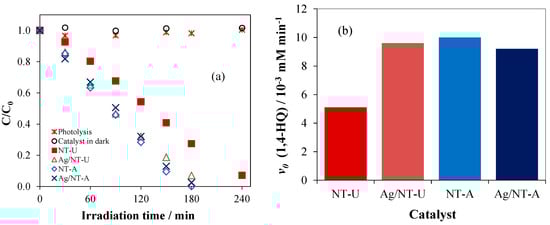 The photocatalytic efficiencies of the catalysts prepared were also investigated by the degradation of 1,4-HQ, using a method based on the luminescence of the starting compound (see Section 2.6). Additionally, blind probes (as comparisons) were measured: in the absence of catalyst (i.e., photolysis designated as “1,4-HQ + Vis”) and with catalyst in the dark (“1,4-HQ + NT-U”). In both blind probes, a negligible change of the initial concentration of 1,4-HQ was observed (Figure 11a). However, in the presence of catalysts, 1,4-HQ successfully decomposed to 100% after 180-min and 240-min irradiation times with NT-A and NT-U, respectively. In addition, the initial rates of photodegradation were 5.1 × 10−3 and 10 × 10−3 mM min−1 for NT-U and NT-A, respectively (Figure 11b).