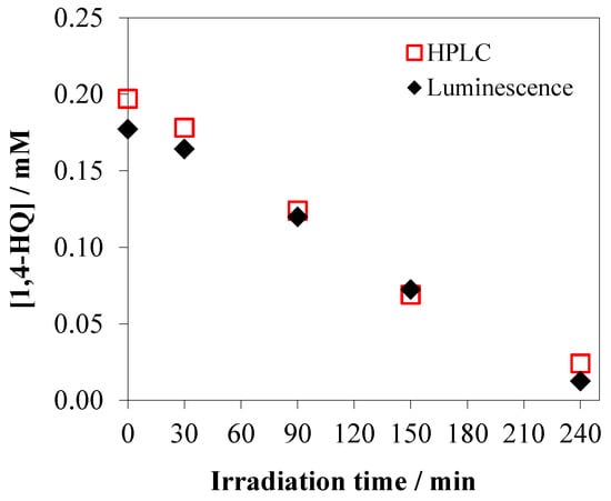 HPLC analyses were also performed in order to investigate the degradation of 1,4-HQ on the NT-U catalyst. The concentrations of 1,4-HQ measured by using HPLC technique were compared to those obtained by the luminescence method. The results regarding the photocatalytic degradation of 1,4-HQ were in full agreement, as shown in Figure 12. This comparison confirmed the reliable applicability of the faster and simpler luminescence method.